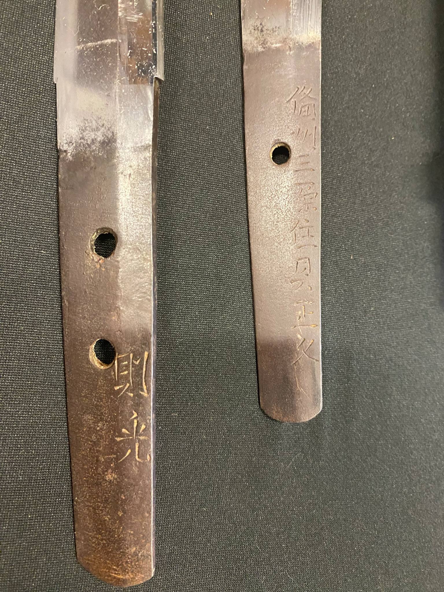 The longer sword (pics rise to right) looks from the shape and nakago to have originally been a kodachi which was later shorted into a katateuchi, a one-handed sword, popular during the Muromachi period. It is signed Norimitsu (則光).