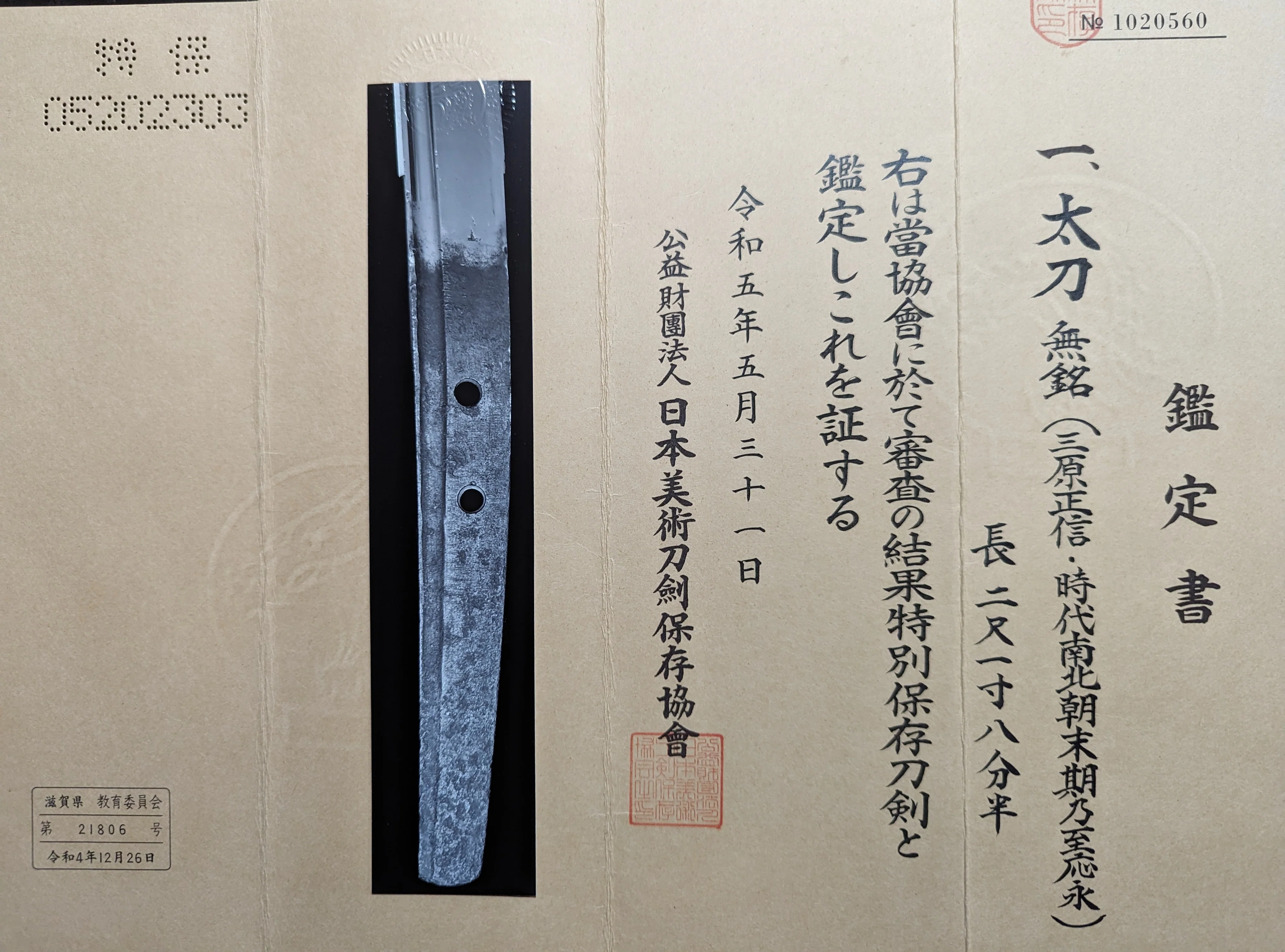 Mihara school is divided into three categories in Japanese sword terminology depending on the period. When the blade is older than the Nanbokucho era(the 1300s), it is called *Ko-Mihara (Old Mihara). And it is called Mihara for those forged in the early-Mid Muromachi period. Finally, Sue-Mihara(Late Mihara) is used for the late Muromachi period. And, Masanobu is classified as a Ko-Mihara swordsmith.