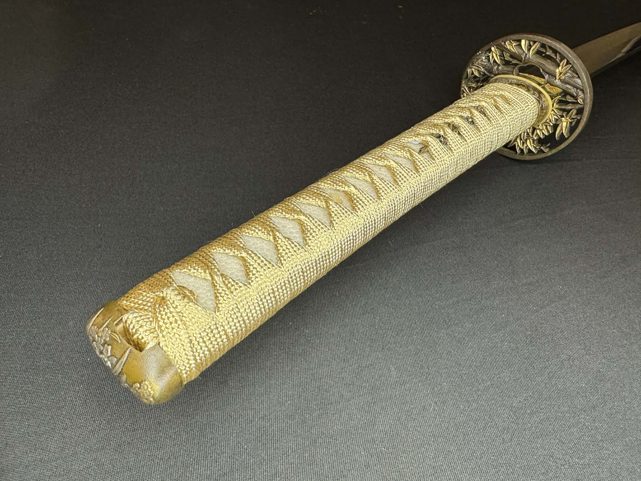 The tsuka is wrapped in white-gold synthetic silk over authentic white ray skin, creating a clean, radiant profile. Brass furniture with a bamboo motif adorns the hilt, while the blade is housed in an emerald green saya with subtle black fleck, evoking a living grove at dusk.